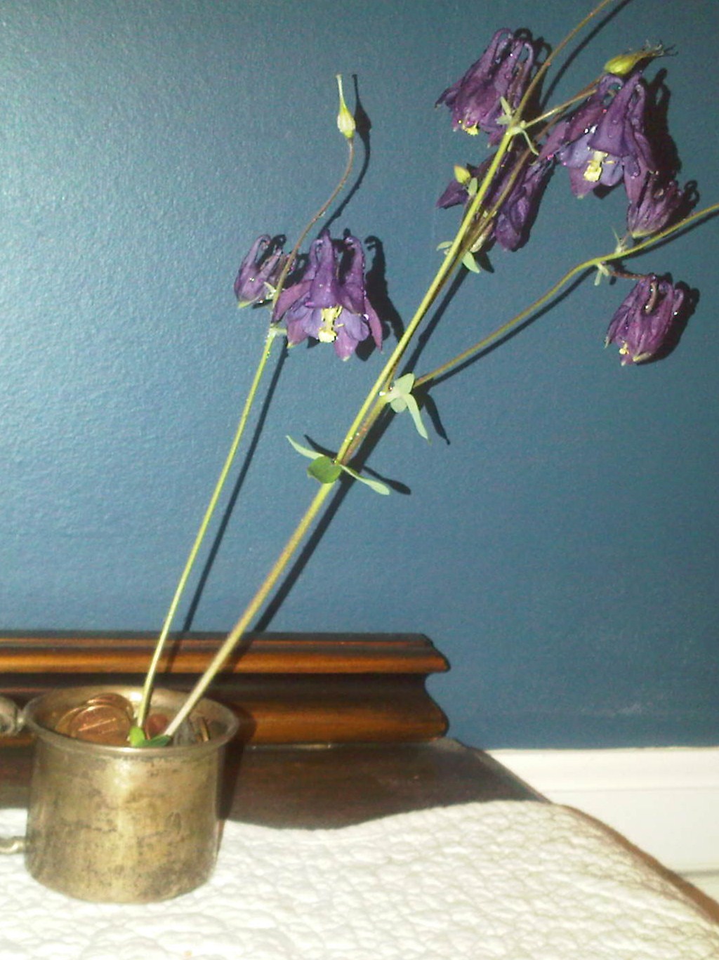 I snipped this columbine from my garden yesterday and plunked it into my own sterling silver monogrammed baby cup. I was grasping for imagery that would communicate my tragically vintage sensibility to my phenomenally hip graphic design friend and artist Mark Wolfe.